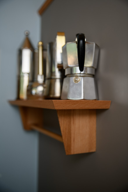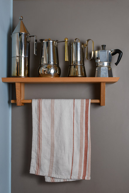 Petite étagère murale multifonction en hêtre étuvé, conçue pour accueillir cafetières et serviettes. Un accessoire compact pour organiser la cuisine avec élégance.