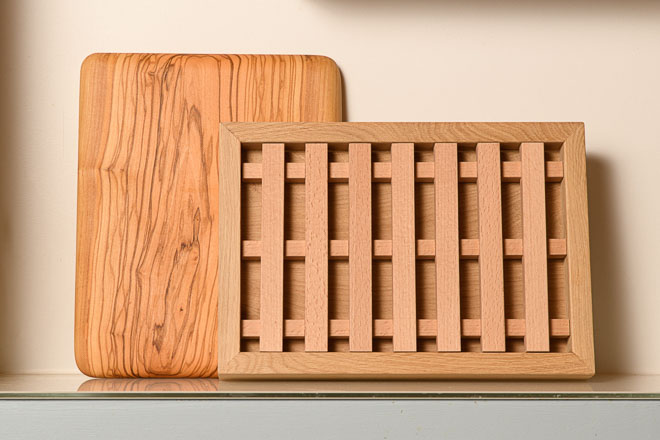 Ergonomiques et esthétiques, ces planches sont réalisées en valorisant des chutes. Ici nous avons de l’olivier, du chêne et du hêtre, mais d’autres essences comme l’érable, le frêne, le cerisier, le noyer… y figurant.