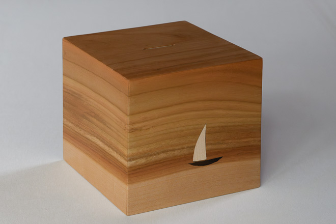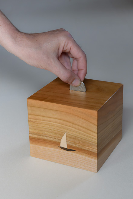 Tirelire pour enfant réalisée en cerisier, agrémentée d'incrustations fines en érable et en noyer. Un objet ludique et précieux pour conserver les premiers trésors.
