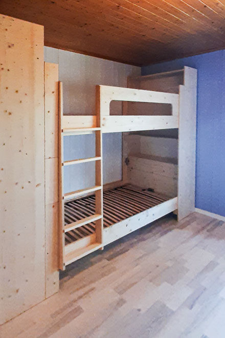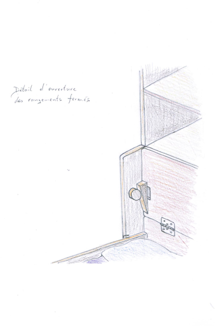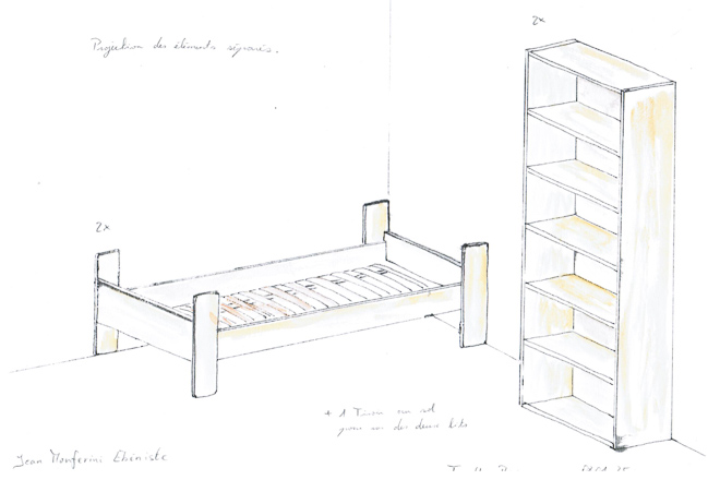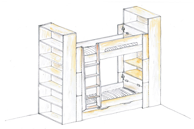 Le dessin est au cœur de ma démarche : une perspective à la main vaut souvent mieux que de longs discours. Ce projet de lit modulable associe rangement et couchage. L'objectif : créer des lits superposés évolutifs, capables de se séparer en deux lits et deux armoires parfaitement identiques lorsque les enfants grandiront et auront chacun leur chambre.
