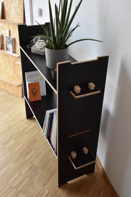Né d’un besoin pour l’atelier créatif « La Main » à Pringy, ce prototype d'étagère modulable se monte et se démonte sans vis. Idéal pour un présentoir mobile lors de manifestations. À terme, ce concept permettra d'assembler plusieurs modules dans une infinité de configurations, à la manière d'un jeu de construction ou d'un système « USM », mais avec la chaleur du bois.