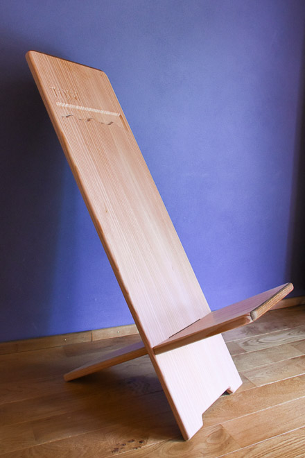 Le client souhaitait une chaise emboîtable évoquant un lieu cher à son cœur. J’ai illustré sur le dossier les cimes du Vanil Noir, du Vanil de l’Ecri et de la Pointe de Paray, sommets emblématiques de la Gruyère. Conception 100% bois : réalisée sans aucun ferrement, elle associe le mélèze et l'acacia pour résister aux conditions extérieures tout en restant démontable.